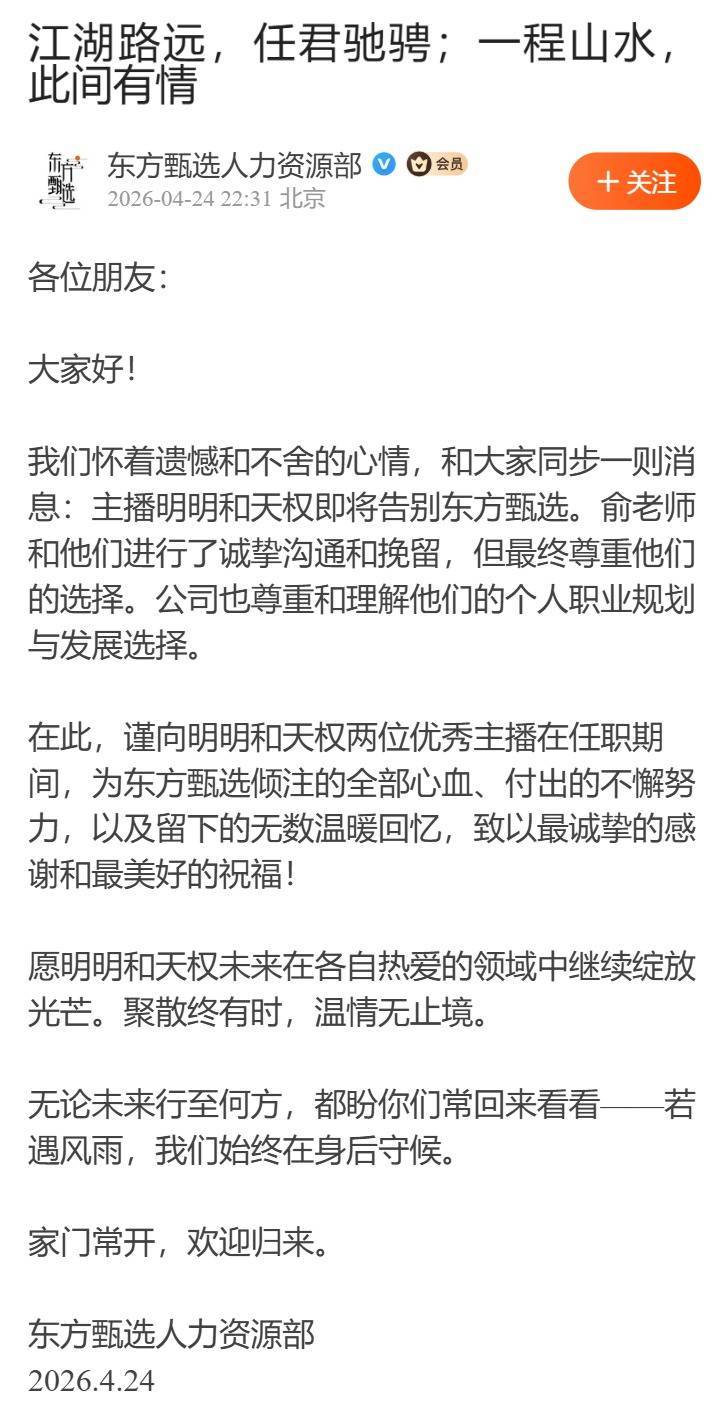 此前一天,东方甄选人力资源部发布公告,宣布明明和天权即将告别。公告称:“我们怀着遗憾和不舍的心情,和大家同步一则消息:主播明明和天权即将告别东方甄选。俞老师和他们进行了诚挚沟通和挽留,但最终尊重他们的选择。公司也尊重和理解他们的个人职业规划与发展选择。”